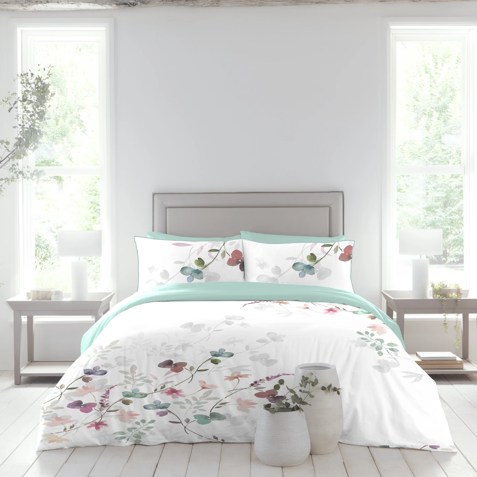 A beautifully fashioned floral panel design with white ground, duck egg reverse and piped pillowcases. Crafted from 100% pure cotton this bedding set is soft, durable, and machine washable. Exquisitely designed, beautifully printed and expertly produced bedding on 100% natural cotton. Appletree’s beautiful range of bed linen contains an array of designs, from subtle plain dye to visually striking prints.